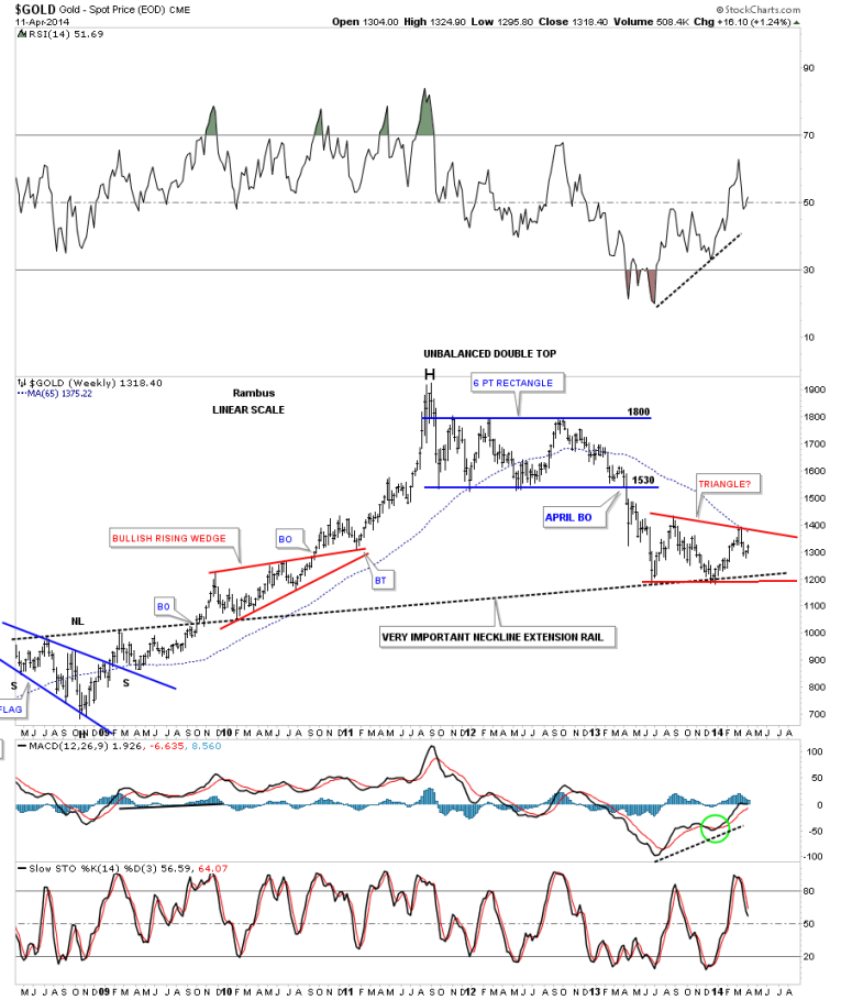 Let's now look at gold’s potential triangle and how it may fit into the bigger picture. Gold’s potential triangle has formed on top of the neckline extension rail that is taken off of the 2008 H&S consolidation pattern in which I extended all the way to the right hand side of the chart. Are we seeing reverse symmetry with our current red triangle vs the red bullish rising wedge that formed in the uptrend on opposite side of the chart?