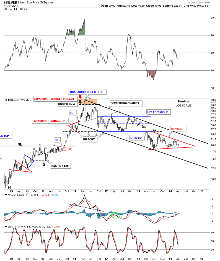 One last comment before we move on. As you know reverse symmetry plays a big role in how I interpret the price action. Until something changes, I’m viewing the blue consolidation patterns, that formed on the left side of the chart with the price action going up, equal to the red triangles on the right side of the chart with the price action going down as reverse symmetry. Since the bull market top in 2011 you can see a series of lower lows and lower highs all the way down to our current price which is just the complete opposite of what we seen in the bull market years. Until we can see a higher low and a higher high the downtrend remains intact.