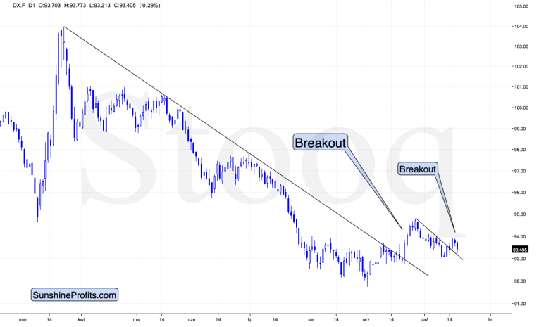 But, before we move to gold, please pay attention to the shape of the last candlestick. The USDX moved relatively lower, almost touching the declining support line.