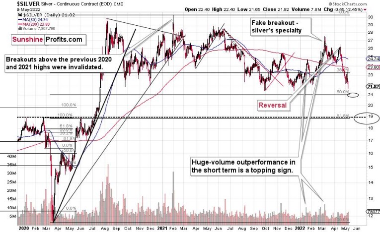 Since gold is likely to move lower, and the general stock market is likely to move lower, I’m moving the downside target lower – slightly above the 50% Fibonacci retracement level based on the entire 2020-2021 decline. That’s the next strong support that’s below the 2021 lows, and that would more or less correspond to the size of the above-mentioned short-term decline in gold (at least that seems realistic to me).