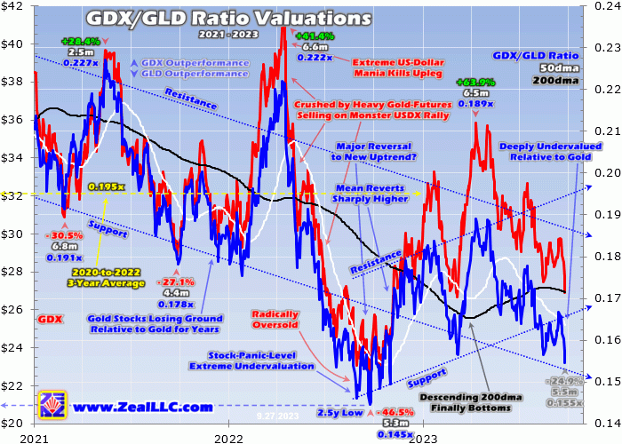 Mid-week GDX and GLD were slammed to $26.91 and $174.10, yielding a GDX/GLD Ratio of 0.155x. That’s on the lower side of recent years’ range, which hit an extreme 0.133x at its nadir during March 2020’s brutal pandemic-lockdown stock panic. Then the violent mean reversion and overshoot out of that was quick to catapult the GGR to a high of 0.241x in late July 2020. That gives some context for today’s valuations.