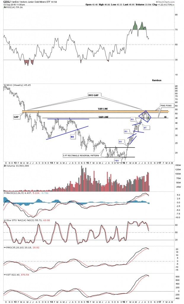 Some of our long-term members may remember some the diamond consolidation patterns that formed during the bear market years that seemed to take forever to complete. Some were not that pretty and had a false breakout above the top rail like the GDXJ. I believe the $XAU ended up with the most symmetrical diamond consolidation pattern of all the PM stock indexes. This weekly chart for the GDXJ shows the end of the bear market and the beginning of the new bull market with the five point rectangle reversal pattern reversing the bear market. Our current diamond pattern is going to tell us if the next move is going to be to the upside or we get our first real correction. Stay tuned as things are getting interesting in this red hot sector.