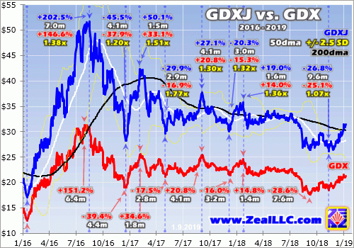 The vertical light-blue lines divide up GDXJ’s uplegs and corrections, which generally match GDX’s but sometimes see major lows or highs out of sync. Each GDXJ upleg or correction shows GDXJ’s total gain or loss, the time that move took in months, GDX’s corresponding move over that identical span, and GDXJ’s leverage to GDX in yellow. The actual full GDX uplegs and corrections are also shown below in red.