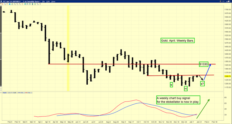 That’s the weekly gold chart. Note the substantial buy signal being flashed by the stokeillator. There’s also a potential inverse head and shoulders bottom pattern forming. The target of that pattern, if it activates, is sell-side HSR in the $1330 area.