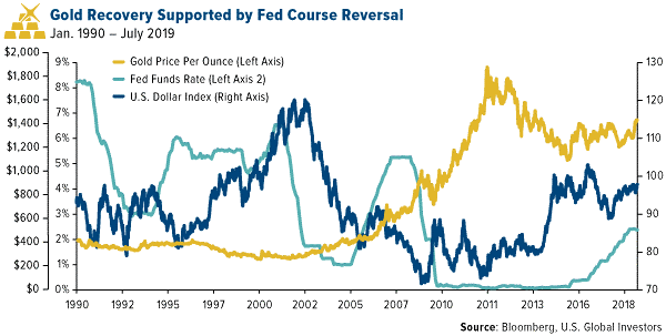 “Gold prices appear on a similar launchpad as 2001 when the Fed began an easing cycle,” McGlone writes in a note dated July 29. “The greatest bull market of this millennium so far began about the time of that first rate cut, following an extended gold-price downdraft and rally in the dollar.”