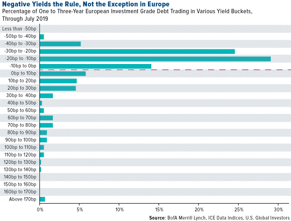 Loyal Frank Talk readers should be aware there’s currently as much as $13 trillion in negative-yielding debt around the world—another contributor to the recent gold rally this year. The yield on the 10-year German bund touched an all-time low today of minus 0.44 percent, while other European bond yields fell on Brexit and trade fears.