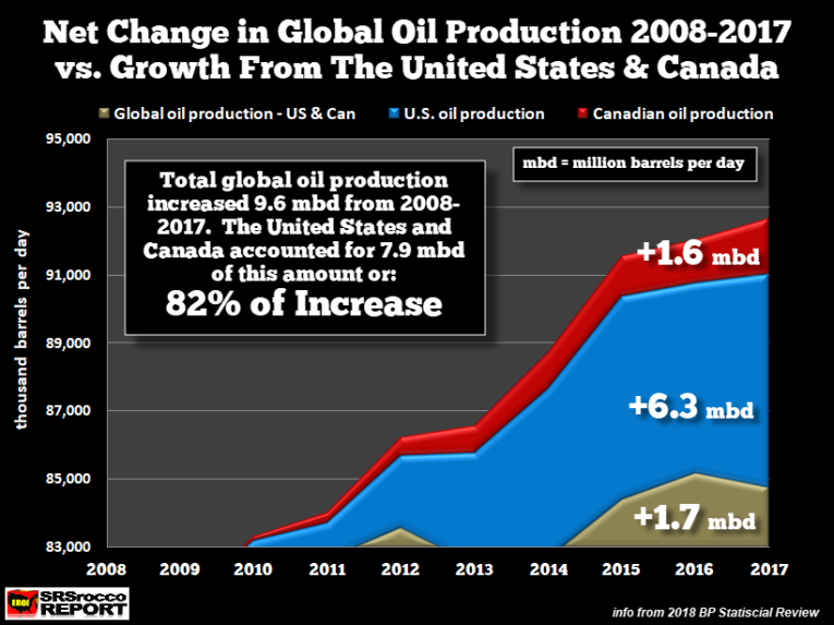 To truly understand the difference in global oil production growth minus the U.S. and Canada over these two periods, this next chart wraps it up nicely: