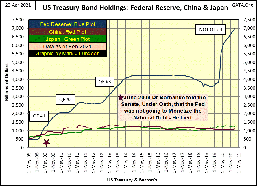 My next chart plots the totals for the Federal Reserve, China and the Grand Totals for the Treasury’s data set. This is a shocking chart; seeing the Federal Reserve’s holding of T-debt (which isn’t included in this Treasury’s Dept data set) has in February 2021 almost exceeded the global grand total eighteen months into Fed Chairman Powell’s “Not QE#4.” From a “monetary policy” stand point, this is a most impressive achievement!