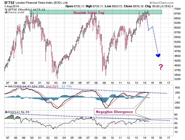 UK’s FTSE Stock Index has bear signs clawing all over its chart: Firstly, there is a bearish triple top, and; Secondly, there is marked negative divergence of the technical indicators.