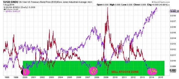 FAST-FORWARD to 2014 to see the US T-Bonds/Dow Ratio has again bottomed, thus announcing stocks are topping out – and preparing to correct. Please note the Dow Index is super-imposed on the graph.