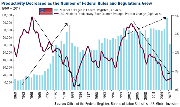 In 2017, the number of pages in the Federal Register, the official list of administrative regulations, dropped to 61,950 from 97,069 the previous year. This is especially good news for productivity. Research firm Cornerstone Macro found that Americans were more productive when there were fewer rules, less productive when there were more rules.