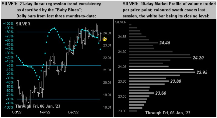 Regardless, rightly mounting as well is the price of Gold on the left per price's daily bars across the past three months-to-date; on balance, that's a fairly healthy panel, albeit the baby blue dots of trend consistency have been struggling a bit to maintain pace. 'Course starting the year on the right foot has placed price near the top of the 10-day Market Profile as shown on the right: