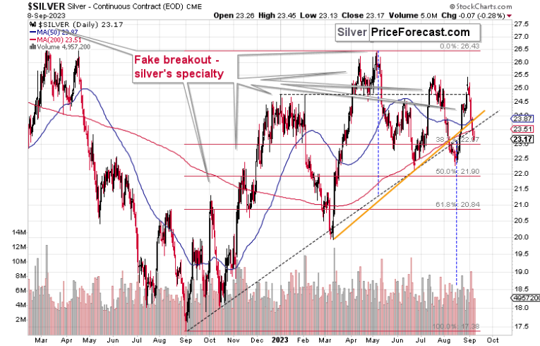 Most importantly, though, silver closed the week below its rising support lines, which spells trouble for the following weeks.