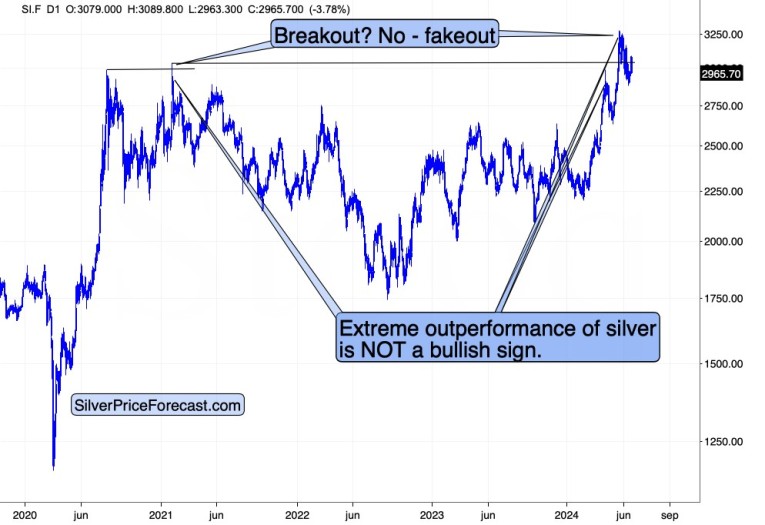 As silver invalidated its moves above the 2020 and 2021 highs, we saw very strong sell signal. Today’s invalidation of the rally is just a cherry on this extremely bearish analytical cake.