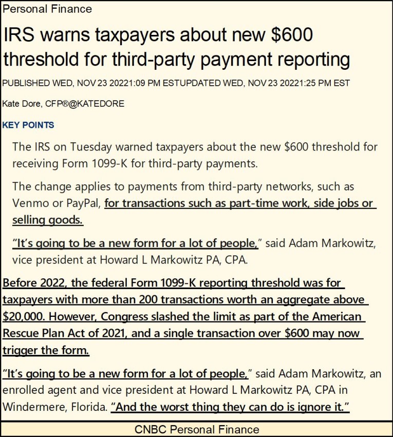 But the good news is that Bill Gates and Warren Buffet have no fear of being surrounded by hundreds of armed IRS agents as their tax returns were audited. No, that honor belongs to anyone who was making a few bucks on the side, and receiving payment via PayPal, or some other payment service. They’ll only begin to use cash once again for payment of these tax-free services that union members and handymen traditionally used for payments.