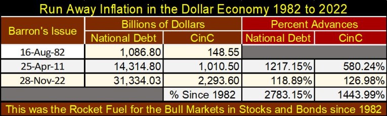 That plus, its last all-time high was in April 2011, over eleven years ago. That is a long time in the markets. Many billions-of-dollars of debt have been added to the US National Debt, and CinC (paper-dollars in circulation) as seen in the table below.