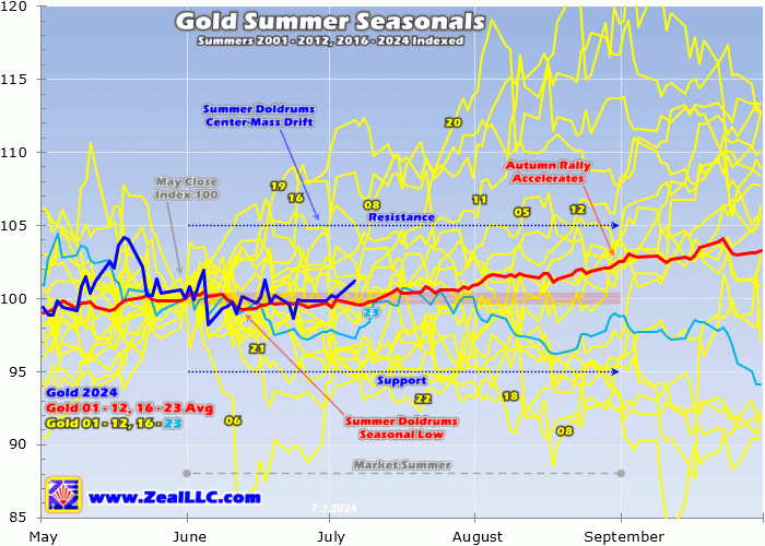 This chart is updated from that latest gold-summer-doldrums essay. It individually indexes all modern gold-bull years’ summers, setting May’s final close to 100. That renders them in perfectly-comparable percentage terms despite very-different gold levels. Then all 20 of these summer gold performances are averaged together in the red line, distilling out summer seasonals. 2024’s action is superimposed in dark blue.