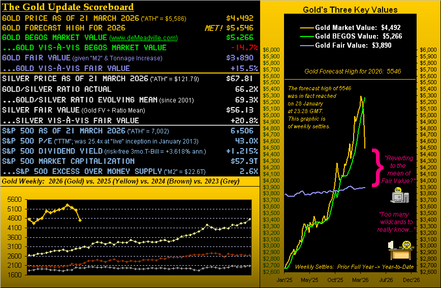 What if — to pay off the StateSide federal debt of now $39T — the Fed merely made an accounting entry of same, and ’twas distributed to all the creditors? To be sure, the “M2” money supply would leap 2.7x from today’s $22T to some $61T. Inflation would become hyper-impalpable. And were it to happen, say, over this weekend, Gold having settled Friday at 4492 would open Monday at 10,606 (by Fair Value precision) … just in case you’re scoring at home. “Got Gold?”