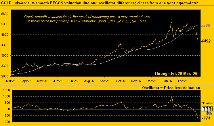 All such negative nattering aside, there is good news: Gold by the opening Scoreboard is now -14.7% below its BEGOS Market Value of 5266, which is a “near-term” view versus the “long-term” Fair Value level of 3890, (above which present price is +15.5%). Obviously it remains to be seen if Gold truly is en route to fully reverting to Fair Value; but strictly by BEGOS, Gold for the near-term moment is undervalued. Thus we wouldn’t be surprised a wit to see Gold buyers come bollocking in for a bounce on Monday, prematurely as they may be given the double-shot of technical adversity. Regardless, here’s our year-over-year graphic of Gold, now -774 points below its BEGOS valuation:
