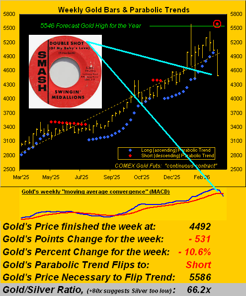 Despite that, again as above graphically described, Gold has just taken a double shot of technical adversity per the weekly MACD and parabolics.