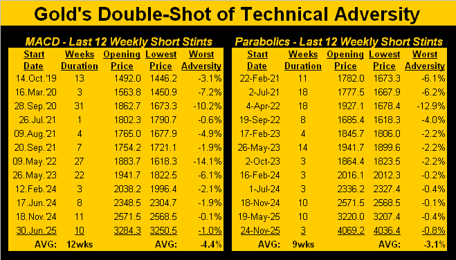 The answer being, Squire, that none of us know. Yet, we’ve history as a hint as to how low Gold may go. The following two-panel table of weekly stints displays Gold’s worst adversity for the last 12 MACD Short signals on the left and for the last 12 parabolic Short signals on the right. ‘Tis important to note that given Gold’s bold performance, adversity certainly from 2023-to-date has been comparatively minimal. And whilst “average” hardly is “absolute”, at the foot of each panel is the average Short weeks’ duration before flipping back to Long: 12 weeks for the more ponderous MACD and 9 weeks for the slightly swifter parabolics. Thus purely within the vacuum of “average” — and assuming the yellow metal opens this Monday ’round where now ’tis at 4492 — precisely hitting the MACD’s -4.4% decline would put Gold at 4294 within 12 weeks, or by the parabolics a -3.1% decline down to 4353 within 9 weeks. ‘Course, given Gold’s expected daily trading range is presently 167 points — let alone the weekly being 340 points — price could touch such adversity in a single day. Here’s the table either way: