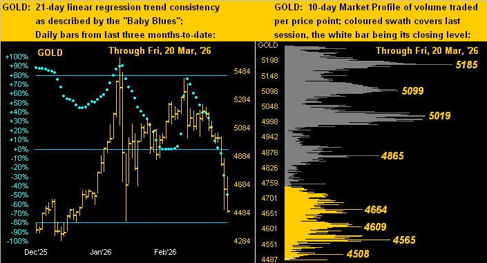 But directionally accurate as ever for Gold are our baby blue dots of linear regression trend consistency as depicted below at left across the past three months. And whilst those “Baby Blues” continue to descend, the lower leftmost cluster of daily bars from last December (4581-to-4284) into which Gold has now penetrated can be structurally supportive. As for the 10-day Market Profile at right, present price barely shows way down there as the wee white bar: