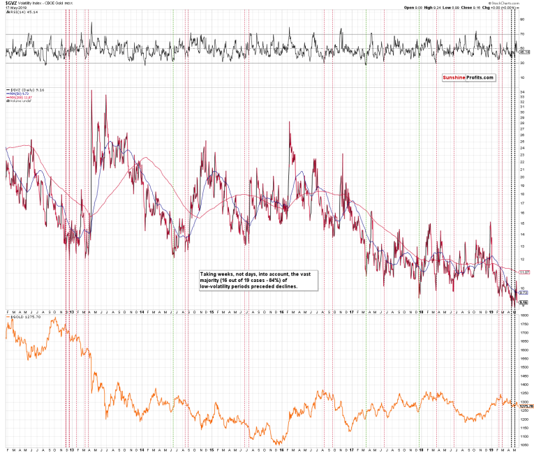 Many goldbugs and other investors will view the lack of volatility as something neutral. After all, gold is not doing much, so why should it have any implications going forward? The point is that it does have implications as almost all low-volatility periods, especially the ones similar to the current one are, were followed by meaningful downtends.