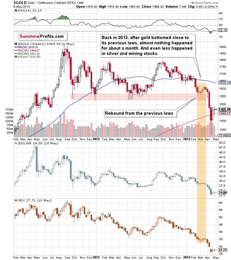 Of course, the above is just my opinion, and I can’t promise any kind of performance of any market, including gold, but please note that the previous months’ weakness in gold and silver mining stocks vs. gold are also just like what we saw in 2013 before the huge slide…