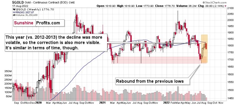 Yes, gold “wants” to decline before soaring (and yes, I do think that it will soar, but it’s simply unlikely before sliding first, similarly to what we saw in 2008), and since that’s the case, it has to decline in some sort of price pattern. What’s the most likely way for gold to decline? Since history tends to rhyme, the previous big declines provide guidance. In particular, the 2013 decline has been repeated to a very considerable (quite extreme, actually) extent.