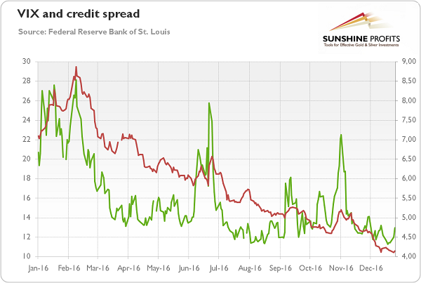 Well, as one can see in the chart below, the level of investors’ confidence has strengthened recently, as both the market volatility (represented by the CBOE Volatility Index) and credit spreads (illustrated by the BofA Merrill Lynch US High Yield Option-Adjusted Spread) have diminished after the US presidential election. Hence, the risk aversion should be low for a while, and equally so the safe-haven demand for gold. Surely, if such risks as China’s hard landing, the banking crisis in the Eurozone or the turmoil in the US bond markets materialize, gold may again shine as a safe-haven asset. However, investors should remember that gold failed to rally on negative news in 2016, while stock markets flourished.
