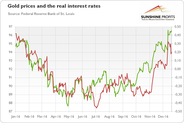 The Fed’s hiking will be gradual, for sure. However, it would be difficult to be more gradual than in 2016, when the US central bank (i.e. the Fed) managed to lift interest rates only once, exactly one year after the previous hike. With the labor market near the full employment and rising inflation and inflationary expectations, two or three hikes in 2017 are not impossible, unless we witness recession, of course. Therefore, the US Dollar Index and real interest rates may be under upward pressure going forward, which would not support the price of gold.