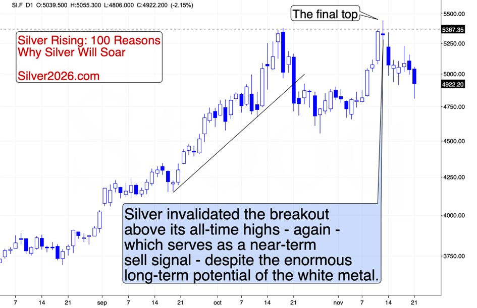 Despite the 100 reasons for silver to move higher, it seems to me that the former is more likely (even if the decline is NOT starting today – as silver was able to recover almost the entire intraday decline). The situation in bitcoin, stocks, and – most importantly – the USD Index, creates an environment in which silver might have trouble rallying. Yes, it’s still likely to soar in the following years, but bigger declines seem more likely in the near and medium term.