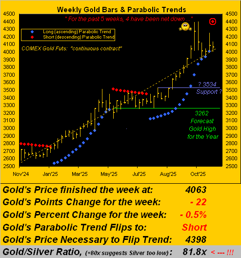 As anticipated in recent missives, Gold’s weekly parabolic trend — after an amazing 17-week run on the Long side — yesterday (Friday) confirmed the awaited flip to Short.  For those of you scoring at home, the flip provisionally arrived this past Tuesday at 04:20 GMT per our post on “X” (@deMeadvillePro), Gold having penetrated below the protective parabolic price of 4004.  Gold then moved on to settle its fourth down week in the past five at 4063, which by the above Scoreboard is nonetheless still +169 points (+4.3%) over Fair Value (3894).   So some additional pullback wouldn’t be untoward.