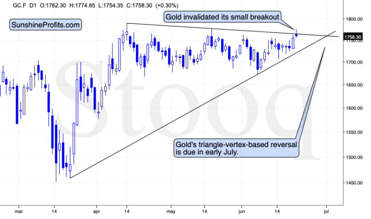 Gold topped about a dollar below the May high and just like it was the case in May, and in April, gold quickly moved down from these levels. Gold futures are at $1,756 at the moment of writing these words, which means that gold invalidated the small breakout above the declining resistance line that’s based on the April and May highs.