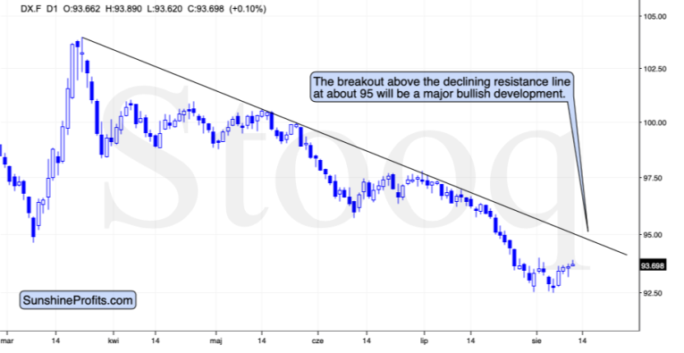 In today’s globalized economy, no market can move completely independently from other markets, and the gold-USD link is particularly important. In many (almost all) cases, major bottoms in the USD Index correspond to tops in gold, so looking at the former is very useful while forecasting gold’s prices. Let’s see how the USDX performed recently.