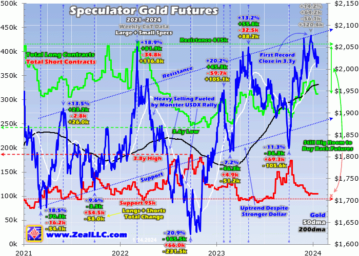 But it ignites much-larger stage-two long buying. In late December when gold achieved that nominal record $2,077 close, total spec longs were running 337.9k contracts. In the several weeks since, they’ve fallen back to 312.0k per the latest CoT. That collective 25.9k contracts of net long selling is the dominant reason gold has pulled back since. Gold futures’ crazy leverage gives them outsized influence on gold prices.