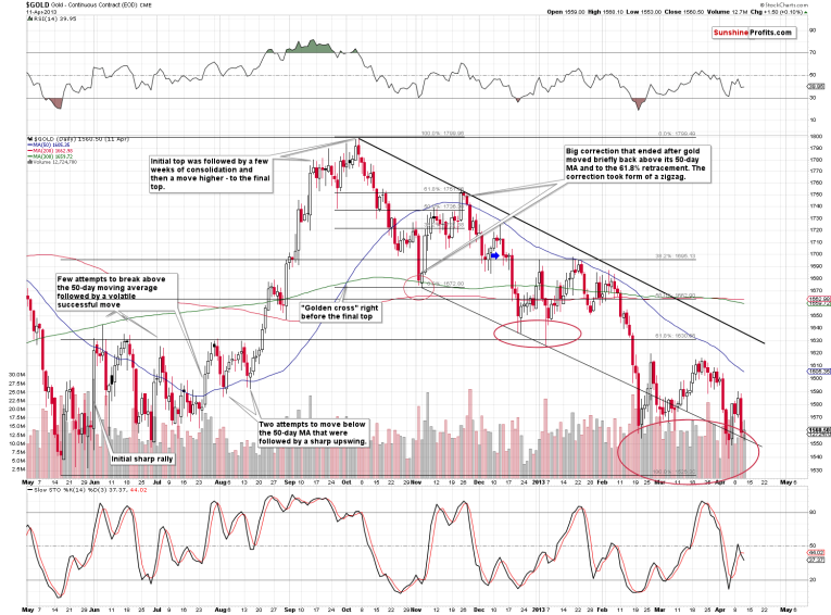 Just like what we saw in December 2012 during the first post-correction decline day (we marked it with a blue arrow), yesterday’s move took gold almost to the previous lows, but not below them. In December, what followed were 2 days of pause and then the decline accelerated. Something similar could very well take place this time. In fact, it’s already taking place. Gold is doing next to nothing, which is in perfect tune with what happened previously. It’s not bullish – it’s normal.