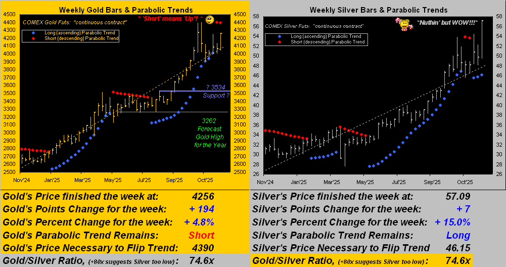 Ya gotta luv it: Friday a week back, Gold confirmed the commencement of a new weekly parabolic Short trend. But from this past Monday’s opening print at 4069 (basis December), Gold (after a wee-hours dip to 4036) strapped on the rocket-pack to conclude the week at 4224. And as contract volume en route rolled from December into that for February, add in another +32 points of fresh premium and Gold settled the week yesterday (Friday) at 4256. ‘Tis a beautiful thAng.