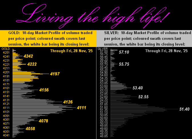 Life at the top is the current state of the precious metals. Here we’ve the 10-day Market Profiles for Gold on the left and for Silver on the right. The respective single white bars are Friday’s settles. Not bad, eh?