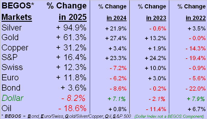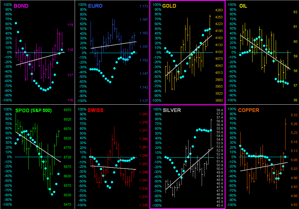 To employ a little liberalized latin lingo: for the “glass half-empty” sagaciti, Gold now priced at 4256 resides +9.5% (+368 points) above the opening Scoreboard’s Fair Value of 3888. However, the “glass half-full” cognoscenti see Gold as just -3.2% (-142 points) below its 4398 All-Time High. So given Gold’s “expected weekly trading range” is now 183 points, (the “daily” per the website being 85 points), next week is within range for Gold to score a further All-Time High.