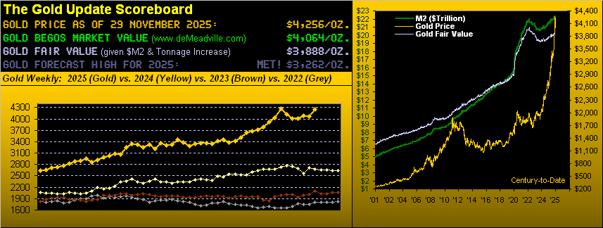 That’s right, folks: Silver through November is +94.9%! Extrapolate her year-to-date pace through the final 22 trading days which remain in 2025, and year-end puts her at 59.74, +104.0%! From Silver’s Friday settle at 57.09, that 59.74 level is a “mere” +2.65 points away. “Doable”, you ask? Absolutely, given Silver’s expected monthly trading range is currently 5.35 points. Moreover, per the aforementioned Gold/Silver ratio now at 74.6x, were Silver priced today to that ratio’s century-to-date average of 69.4x, she’d already be +7.4% higher from here at 61.32 … just in case you’re scoring at home in anticipation of means reversion.