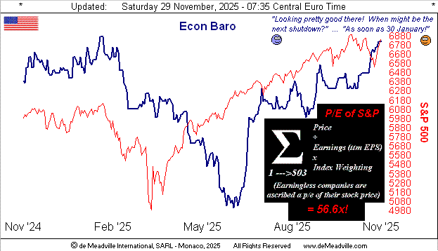 Now to peek at the Economic Barometer and accompanying S&P 500 (red line). And you know the old expression that when government is out of the way, (i.e. “gridlock is good”), the economy is less suffocated. However: even though nearly three weeks have passed since the StateSide “shutdown” was resolved, there actually is an increase in missing metrics as bureaus are strained to “catch-up”. In fact, since 01 October, there’ve been 98 scheduled Econ Baro metrics, of which half (49) are now missing; a week ago ’twas 46. All that said, such absence of data has evolved into a rising Baro such that we penned in yesterday’s Prescient Commentary “…the Econ Baro has returned to its highest level since last February, which if detected by the FOMC may see rates held steady rather than cut come the 10 December Policy Statement….”:
