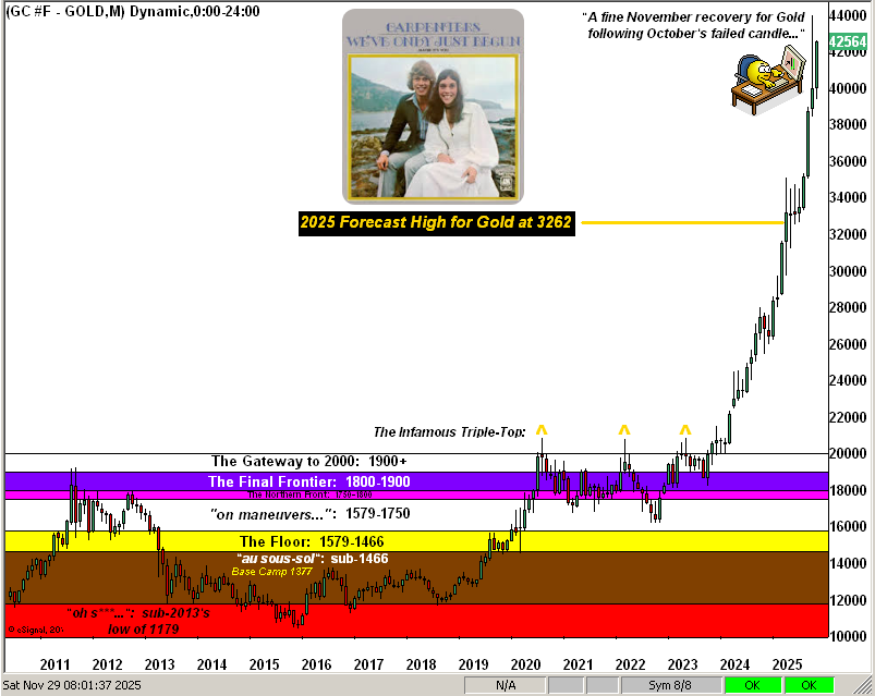 Toward this week’s wrap we’ve the Gold Structure by the month across the past 16 years. Concern over the last month’s “failed” October candle was short-lived, albeit let us be cognizant that we’ve only just begun a weekly parabolic Short trend, (which with bullish persistance, too, shall fail of its own accord).
