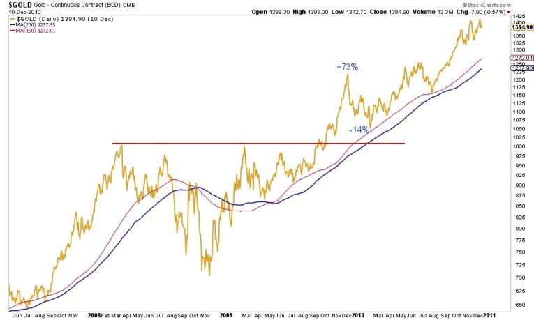 In the autumn of 2009, Gold broke $1000/oz. It surpassed $1200/oz before correcting 14%, down to its 150-day moving average.