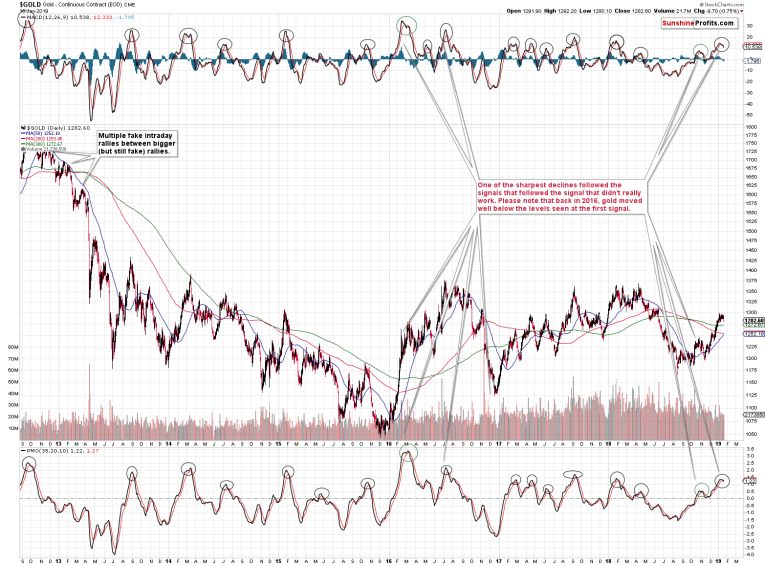 They are both very useful for detecting major tops in gold. They were extremely effective in the previous years. There were two cases when they didn’t indicate a huge decline. One of those cases was in 2016 and the second one was in late 2018. This is interesting because of two reasons: