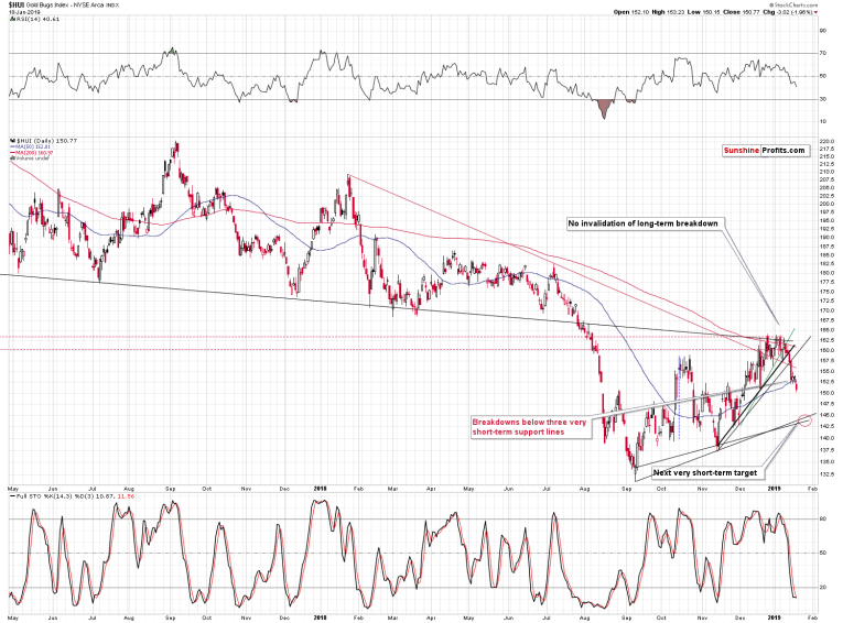 In short, yes. All short-term breakdowns below rising and declining support lines are now confirmed, and we even saw a move below the 50-day moving average. Gold miners’ low that we saw on Friday was below the late August 2018 high. If anyone had any second thoughts about whether gold stocks underperform gold or not, they have their final proof – gold’s late-August high is $1,221.