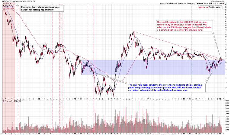 [The recent upswing in the miners] probably doesn’t look familiar, but it actually should. We saw almost identical corrective upswing in mid-2015. The previous rally started from a bit lower levels and ended a bit lower as well (we used the blue rectangle on the above chart to make the comparison easier), but the differences were tiny. The entire size of the upswing was extremely similar, and we marked it with a blue dashed line. Copying the previous decline to the 2018 bottom shows that the current upswing’s end (assuming that it ended) is very much in tune with where the rally should have ended based on the 2015 - now similarity. Moreover, both rallies ended when GDX moved a little above its 200-day moving average.