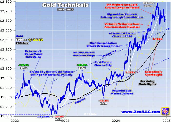 Gold plunged from that extreme 18.3% above its 200dma to just 7.1% over in mid-November, then again to only 5.4% above after mid-December’s latest Fed decision. Despite an apparent big hawkish surprise testing gold’s monster upleg, it held strong. Though gold plunged 1.9% to $2,593 on top Fed officials’ projecting slower rate cuts ahead, it remained way above correction territory which starts down at $2,507.