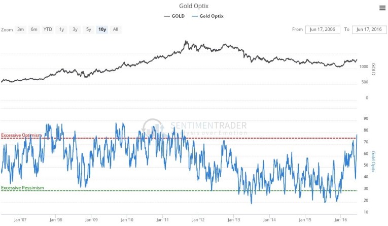 The latest gold Optix, or optimism chart, likewise sounds a warning bell, with optimism spiking to an extreme reading that has immediate bearish implications.