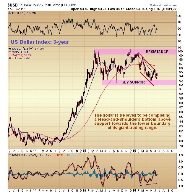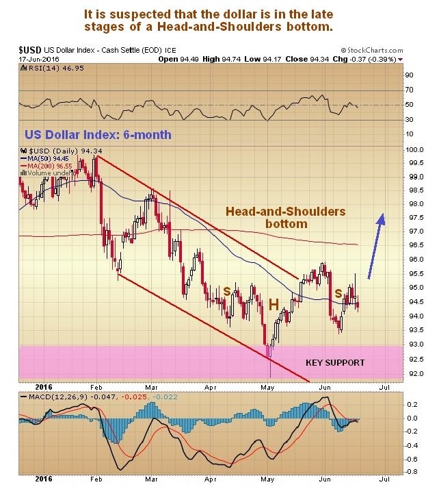 On its 6-month chart it looks like the dollar index may be working on completing the Right Shoulder of a Head&Shoulders bottom. If so, a sizeable rally is brewing.